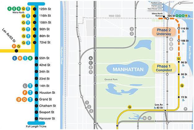 The Second Avenue Subway is a major subway line expansion project in New York City. Phase 1 of the Second Avenue Subway was already completed, and Phase 2 was in the planning and design stages. Here’s a representation map of the construction of Phases 1 and 2.