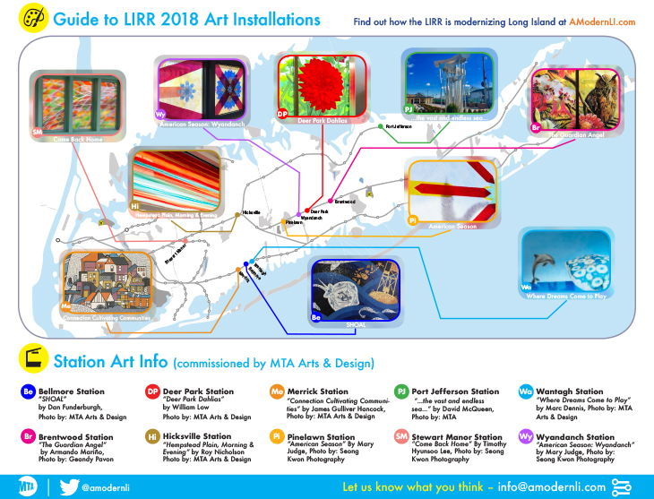 Creating a map of LIRR (Long Island Rail Road) art installations provided by the MTA (Metropolitan Transportation Authority) can be a useful project to showcase the various artworks throughout the LIRR system.
